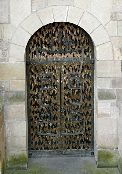 Der durchbrochene Bronzeguss des Portals aus "Flammen" erinnert an alle Bischöfe, die mit dem Dombau besonders verbunden sind.