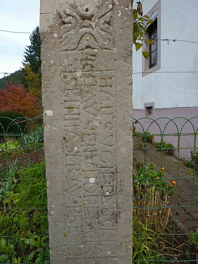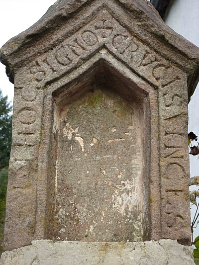 Die schaftparallele Inschrift nennt als Errichter HANS VON PLECKHAUSEN UND MERG SEIN HASFRAU PRENER ZU SANT.