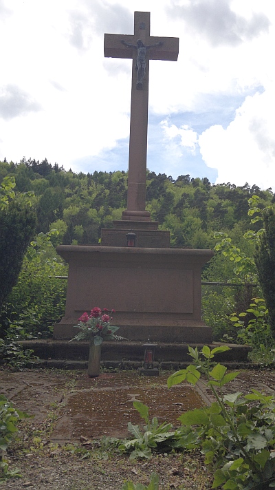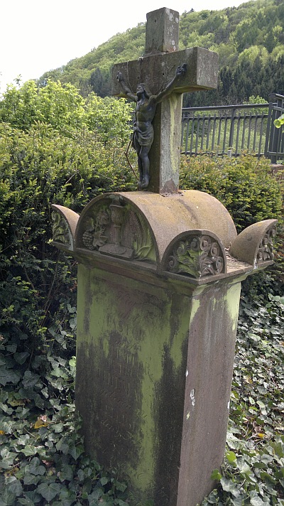 Friedhofskreuz, einfaches Balkenkreuz über mehrfach gestuftem Sockel, hier bezeichnet: P. J. LEONHARD, BILDHAUER IN TRIER N. 844, † 1821