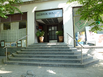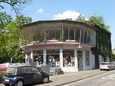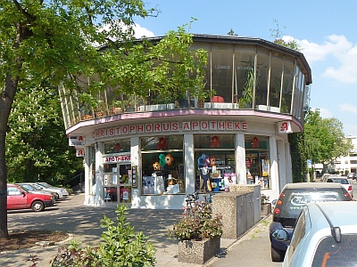 Die Gestaltung des Eckbaus folgt mit ihrer leichten, durchsichtigen, fast "körperlosen" Bauweise den Idealen des Bauens in den 1950er Jahren.