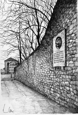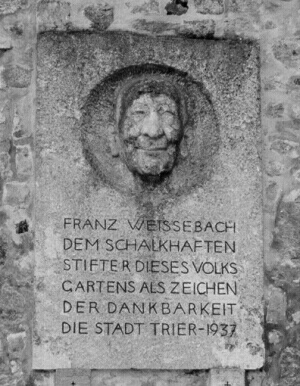 Aus der kreisförmigen Vertiefung der Tafel an der alten Stadtmauer im Trierer Palastgarten lugt das schelmische Gesicht Franz Weißebachs (1860–1925) hervor. Er war ein erfolgreicher Kaufmann und Mitbesitzer des Weingutes Kanzemer Berg. Geschaffen wurde die Gedenktafel von Paul Siegert (1905–1982) und erinnert an den Wunsch Weißebachs, sein Erbe als Beitrag zum Allgemeinwohl aufzuwenden. Er vermachte sein Vermögen der Stadt Trier mit der Auflage, dass von diesem Geld ein Krematorium gebaut werden solle. Würde diesem Anliegen im Stadtrat fünf Mal nicht stattgegeben werden, so könnte mit Hilfe seines Erbes ein Volksgarten angelegt werden. [1]