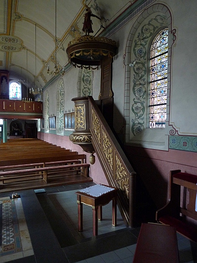 Der Chor ist rippenlos kreuzgewölbt und wohl erst beim Anbau des Schiffs kreuzbogig geöffnet. Das Schiff ist gerade gedeckt. Kanzel und Kommunionbank des 18. Jahrhundert wurden 1845 von ungekannter Stelle hierhergebracht. Ein erwähner Taufstein von 1662 ist nicht mehr vorhanden. [1]