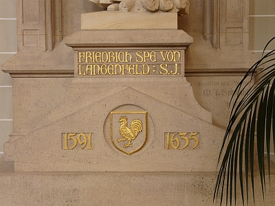 Das Denkmal wurde im Jahre 1897 von Matthias Schmahl (1830 - 1897), einem Pfarrer in Longuich an der Mosel gestiftet. Ausführender Künstler war der Kölner Bildhauer Professor Wilhelm Albermann (1835 - 1913). Die Gestalt Spees erscheint heroisch stilisiert. In der Linken hält Spee die "Cautio criminalis", seine 1631 anonym erschienene Kampfschrift gegen den Hexenwahn. Zu seinen Füssen lodert ein Scheiterhaufen, den er in symbolischer Geste austritt. Auf dem Postament unterhalb der Figur erkennt man Spees Familienwappen, den (roten) Hahn auf weißem Grund. [1]