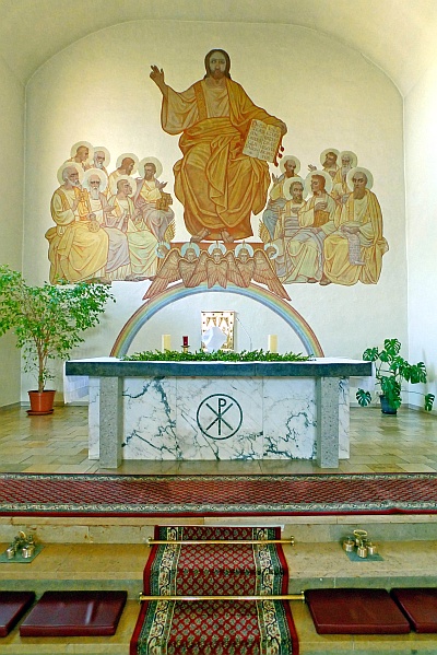 Von der Innenausstattung fällt besonders das Bild vom Abendmahl auf, 1948 von Pater Seemann, gemalt, das den gesamten Chorraum beherrscht. Ein Steinrelief des 17. Jahrhunderts - mit der Muttergottes in der Mitte und Anna Selbdritt und dem heiligen Martin in den Seitennischen - ist als rechter Altaraufsatz zu sehen. Eine schöne Kreuzigungsgruppe steht über dem linken Altaraufsatz, ein Werk des gebürtigen Wiesbaumers Michael Raetz. Einige ältere beachtenswerte Holzfiguren, die wohl wie das Steinrelief aus der alten Kirche übernommen wurden, schmücken das Kircheninnere, zum Beispiel die heilige Helena, die heilige Elisabeth und der heilige Sebastian. [1]