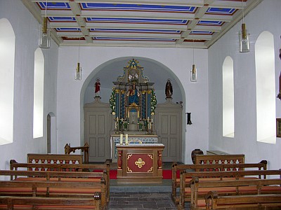 [...] Die Baugeschichte nicht geklärt; Schiff und Chor in der heutigen Erscheinung von 1848, vielleicht unter Einbeziehung älterer Teile. Den klassizistischen Gesamteindruck bestimmen außen die straffe Achsengliederung durch dicht gereihte Rundbogenfenster, der trotz des Einzugs in den Gesamtumriss integrierte polygonale Chor und das schon neugotisch profilierte Traufgesims, innen die kassettierte Flachdecke und die fensterlose Apsisrundung. Der ungegliederte, wehrhaft geschlossene Turm mit segmentbogigem Eingang auf der Ostseite und eingezogenem, achtseitigem Spitzhelm stammt angeblich aus dem 18. Jahrhundert, doch ist auch eine Entstehung im Mittelalter nicht auszuschließen. Auf einen älteren Bau verweisen jedenfalls zwei am Turm eingemauerte figürliche Reliefs des 16. oder 17. Jahrhunderts. Unter dem Chorbogen steht ein Säulenaltar des 18. Jahrhunderts, der zusammen mit seitlich anschließenden Holzwänden den Chorraum als Sakristei vom Schiff abtrennt. Gestühl des mittleren 19. Jahrhunderts. [1]