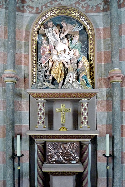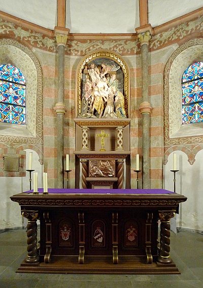 > Früherer Klosterbereich: spätromanische basilikaförmige ehemalige Kloster- und heutige Pfarrkirche Sankt Leodegar, im 17. Jahrhundert erbauter Nordflügel, mit der Kirche verbundener barocker Westflügel, teilweise von alter Klostermauer umgrenzt.