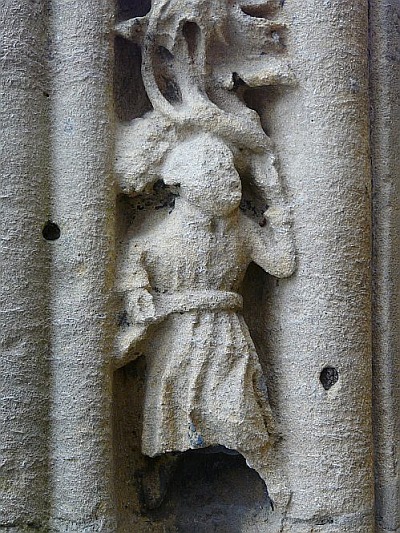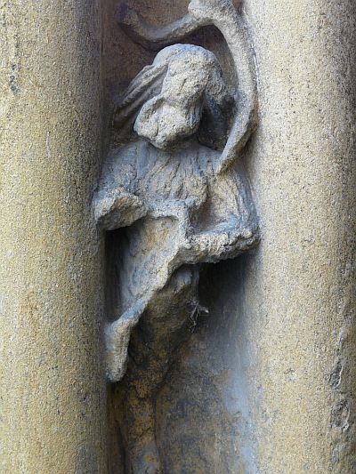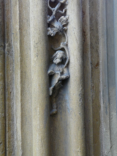In den Archivolten die Sitzfiguren der 12 Apostel, höhe etwa 0,30 m, im Scheitel die Halbfigur Christi in Wolken. Daneben zwei Kehlen mit freigearbeitetem Weinlaub und Traubenranken, die unten in kleinen Figürchen endigen (Engel, Priester, wilder Mann). Die Apostel sind derbe, frische bodenständige Arbeiten in breiter, schwerer Formgebung und gehören dem beginnenden 15. Jahrhundert an. [1]