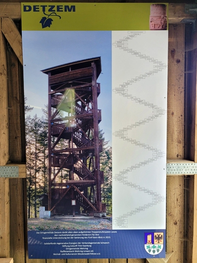 Mehr als 25 m hoher Aussichtsturm oberhalb des Ortes Detzem, der einen Panoramablick auf den Moselabschnitt zwischen Trier-Quint und Klüsserath und die dahinter liegende Eifel gewährt.