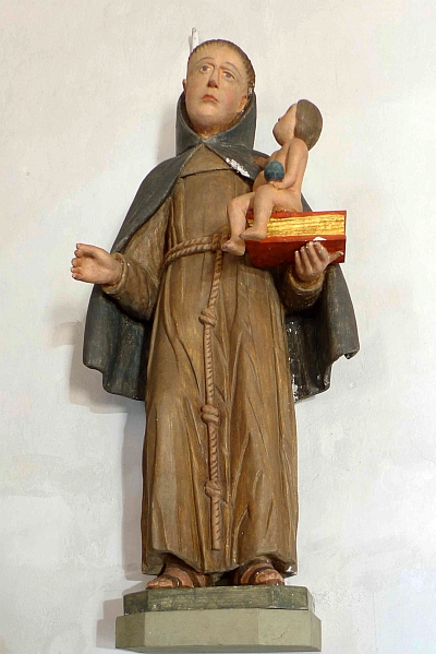 Antonius von Padua 1195 – 1231 Kirchenlehrer wird angerufen zum Wiederfinden verlorener Sachen. Beide Figuren aus dem 17. Jahrhundert stehen im Chor neben dem Hochaltar. Wahrscheinlich alte Kapelle.