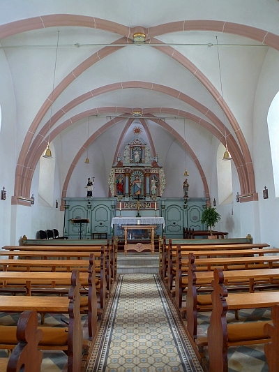 Der heutige Bau – im Eigentum der Zivilgemeinde – stammt aus dem Jahr 1734. Es ist ein einfacher geputzter Bruchsteinbau, im Lichten 6,94 m breit und mit dem dreiseitigen Chorschluß 12,25 m lang. Auf dem Westende des Daches erhebt sich der markante achtseitige Schieferturm mit zweimal aufeinander folgender Zylinder und Zwiebelform, durch Gesimse unterbrochen und 1954 erneuert. Der Innenraum ist mit Tonne und Stichkappe gewölbt, deren Hohlkehlrippen auf breite, flach vortretende Pflaster nebeneinander aufsetzen.
