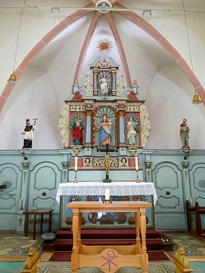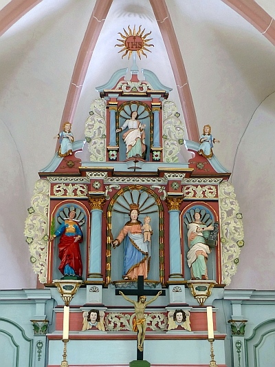 Der Hochaltar aus der Zeit um 1700 (wohl aus der viel älteren, aber 1687 erwähnten Kapelle) in Wandform mit drei Nischen zwischen den Säulen, stellt ein Motiv dar, welches sich im Aufbau wiederholt, bei niedriger geschweiftem offenem Giebel. Alles ist von Akanthusranken begleitet, die sich auf den freien Flächen zeigen. Die einfachen seitlichen Wandabschlüsse des 18. Jahrhunderts sind mit Pilastern, Volutenblasen und sparsam verteiltem Rokokozierrat ausgestattet. In den Nischen des Altars befinden sich Figuren der Gottesmutter, der heiligen Luzia und Barbara und oben der Patronin, der heiligen Katharina. Auf den Abschlüssen die des heilgen Johannes von Nepomuk und Donatus, und über der schöne hölzernen Eingangstür die des Erzengels Michael, eine Stiftung von Herrn Michael Pick.