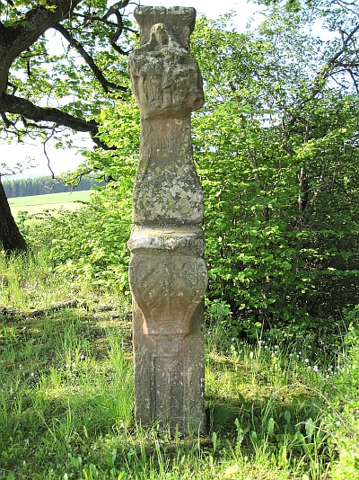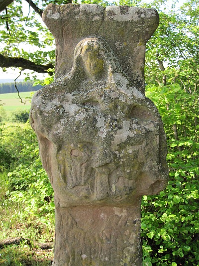 Die Bildstockwanderung folgt der Mehrener Straße, unterquert die vormalige Bahntrasse und lässt den früheren Bahnhof Schalkenmehren links liegen, der dem Dorf mit der Eröffnung der Bahnstrecke Daun-Wittlich eine bis dahin nicht gekannte Entwicklung eingebracht hat. Gegenüber biegen wir rechts ein und gelangen auf den Weg zur Heringsmühle in Richtung Alftal bis zur nächsten Unterführung des heutigen Maare-Mosel-Radweges. Über diesen Radweg führt streckenweise auch die traditionsreiche Wallfahrt der Sankt Matthias-Bruderschaft in Richtung Udler. Durch die Unterführung hindurch, in Sichtweite des Bintenerhofes, an der Weggabelung zum 7-Maare-Weg, biegen wir rechts hoch in Richtung Schalkenmehren. Kurz danach steht linkerhand auf einem etwas erhöhten Punkt das sogenannte Unterste Steinkreuz, ein gut erhaltenes hohes Schaftkreuz aus Basaltlava. Der Bildstock mit seinem Abschlusskreuz wurde vermutlich 1732 errichtet, eine umfassende Renovierung erfolgte im 20. Jahrhundert. Der Altarvorsprung ist geradlinig, die bauchartige Erweiterung und das Blattzierwerk weisen auf eine Barockform hin. Die Inschrift lautet: "Carl Johannes Dulus Peeschu, S.H.F. EW., E(rbaut) 1732, R(enoviert) 1931". Das breite Kapitel zeigt eine Pietà mit zwei Beifiguren und zwei Engelsköpfen. Früher führte eine der Bittprozessionen in der Woche vor Christi Himmelfahrt bis zu diesem Untersten Steinkreuz, nach dem der Volksmund auch die Gemarkung benennt. Später wurde diese Bittprozession nur noch bis zum Obersten Steinkreuz durchgeführt, an der nachfolgenden Weggabel gelegen. Dieses Wegekreuz aus rotem Sandstein ist stark verwittert. Das Barockkreuz weist einen Altaraufsatz auf sowie dachartige Zierstücke auf der vorderen Fläche und den beiden Seitenflächen des Schaftfußes. Die ursprüngliche Inschrift "Anno 1713 -Johannes Hermes" ist überliefert, aber nicht mehr zu lesen. Darüber erkennt man eine aus dem Sandstein herausgearbeitete Pietà. [1]