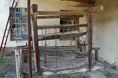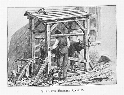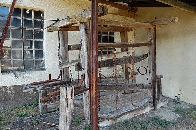 Im Volksmund wurde diese Vorrichtung als " Notstall " bezeichnet. Die Tiere wurden angebunden, die Hufe in die Höhe gezogen und dann beschlagen. [1]