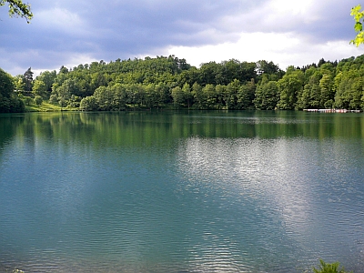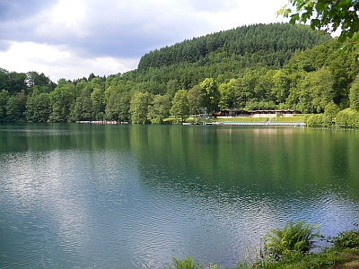 Circa 1,5 km südlich von Daun, mit einer Wasserfläche von ca. 7,2 Hektar, liegt mit etwa 2/3 auf der Gemarkung Schalkenmehren, mit 1/3 und dem Teil des Freibades in der Gemarkung Gemünden (Stadt Daun).