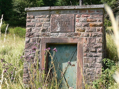 Wasserhochbehälter der ehemaligen Wasserversorgung Schutz - errichtet 1925. Das Bauwerk steht in einer Wiese rechts der Kreisstraße 6 - Richtung Deudesfeld. [1]