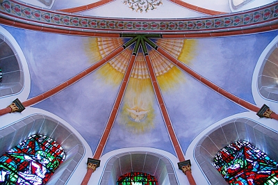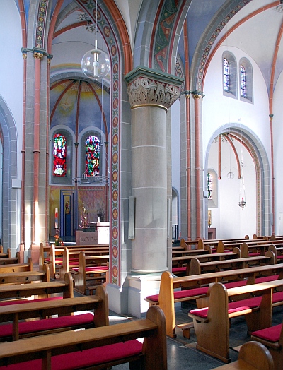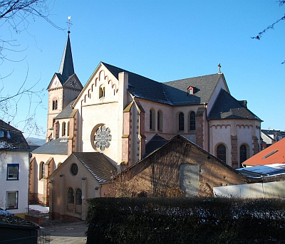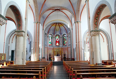 Neuromanische dreischiffige Basilika, 1870/71, Architekt Reinhold Wirtz, Turm 1754, Glockengeschoss 1893; Ausstattung unter anderem aus den Vorgängerbauten. [1]