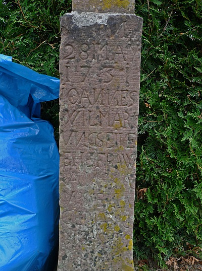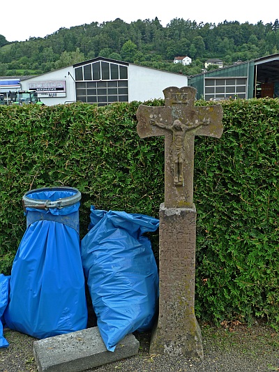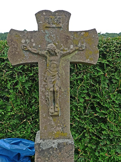 Ungewöhnlich die genaue Datumsangabe. Das Abschlußkreuz mit Korpus und gespaltenen Balkenenden sicher wesentlich jünger, wohl 19. Jahrhundert. [1]