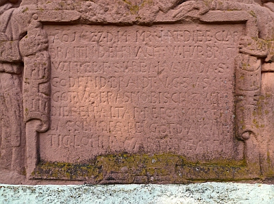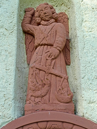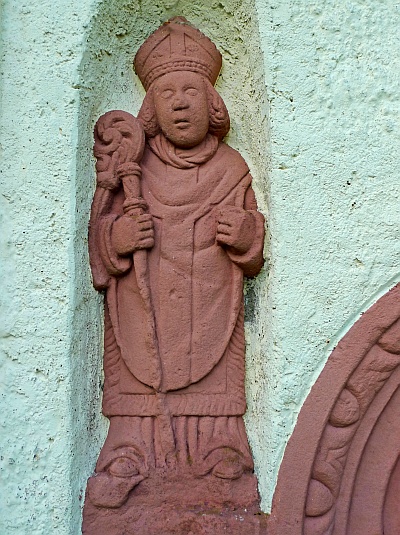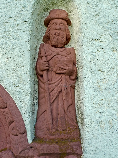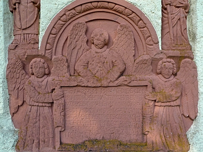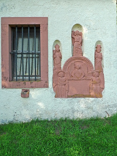 In die Südwand der Sakristei ist außen ein steinerner Altaraufsatz von 1622 mit drei zugehörigen Figuren eingelassen. [1]