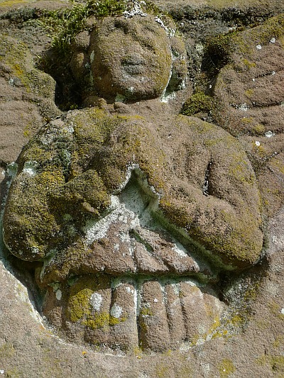 Der Aufsatz vom sog. Schönecker Typ ist mit den stark plastischen Figuren der Maria und des Johannes zu Seiten des Gekreuzigten, der hier im Umriß der Reliefplatte bleibt, ausgestattet.
