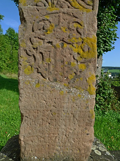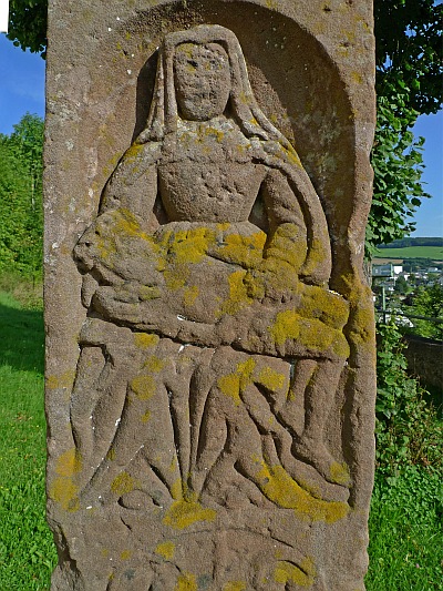 Am geraden Schaft befinden sich beidseitig Ranken und eine Blütenrosette, vorne von unten nach oben die nicht mehr lesbare Errichterinschrift, eine Wappenkartusche, ein flaches Pietä-Relief in einer Rundbogennische und die aus dem Schaft herausragende Halbfigur eines betenden Engels.
