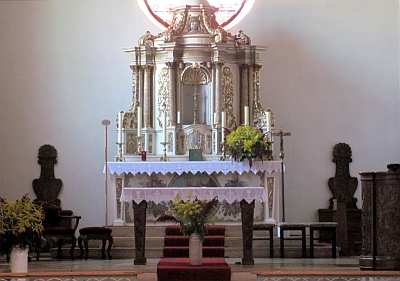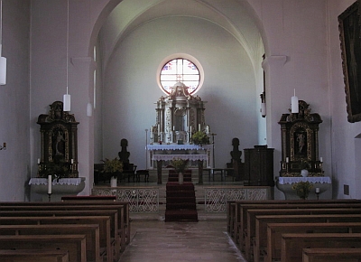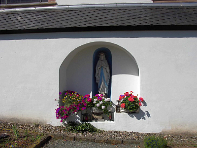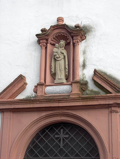 Das Kirchenschiff ist einfach, mit teils vermauerten Rundbogenfenstern. Auf der Giebelseite befindet sich über dem Giebelwalm ein verschieferter Dachreiter. Das Sandsteinportal ist eine formale Wiederaufnahme der Nebenaltäre im Innern. Den Rechteckrahmen, der das Bogenportal umschließt, verdacht ein gesprengter Dreieckgiebel mit einer säulenflankierten Baldachinnische in verspätetem Rokoko in der Mitte und einem Chronogramm im Sockel.