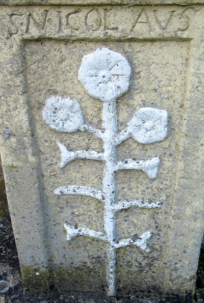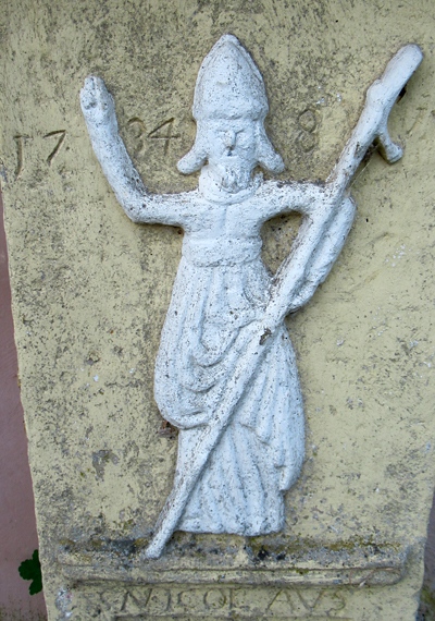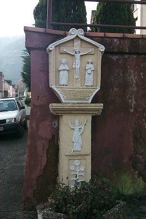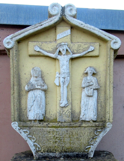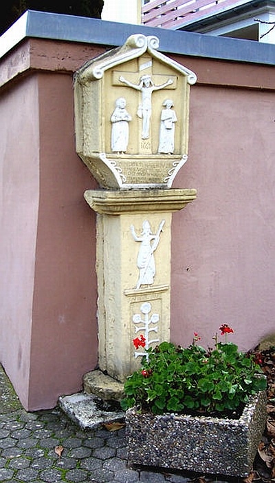 Kreuzigungsbildstock auf Setzstein. Ehemals am Fährhaus vermauert, jetzt nahe am alten Standort aufgestellter Sandsteinbildstock. Erneuerte derbe Arbeit unter Anstrich. Am Pfeilerschaft flaches Blumenornament und darüber der Schifferheilige Nikolaus. Am dreieckig verdachten Aufsatz weist die Stifterinschrift (Hans und seine Ehefrau Margarete von Reinig, 1661) den Bildstock als den ältesten der Gemeinde aus und erinnert so allein an die Bedeutung Reinigs als Fährstation und Schifferort. Am Schaft die (Hochwasser- ?) Marke 8. Jul. 1734. [1]