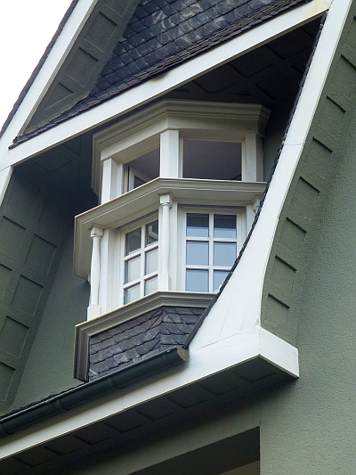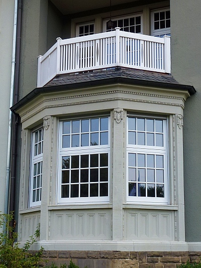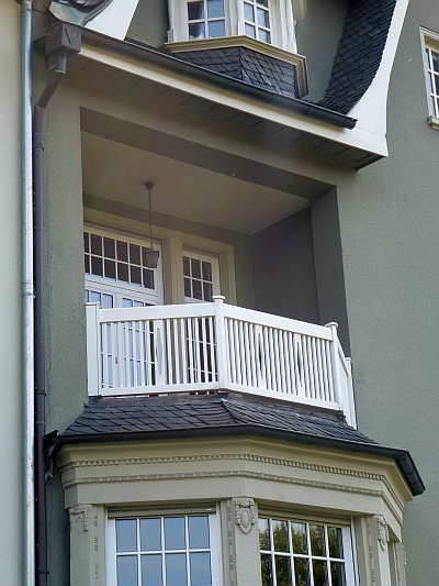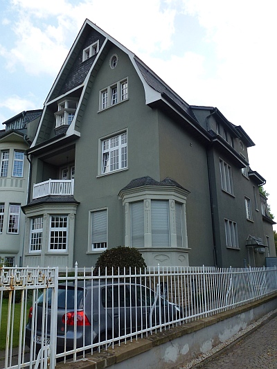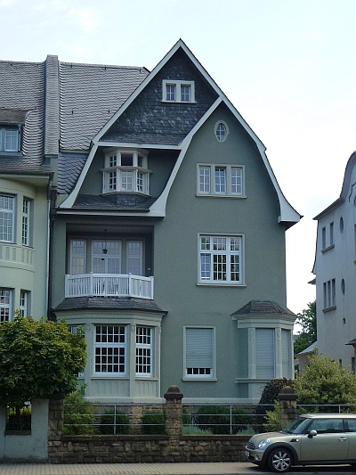 Aufwändige Reihenvilla im Landhausstil, 1911 / 12, straßenseitige Einfriedung und Gartenlaube bauzeitlich.