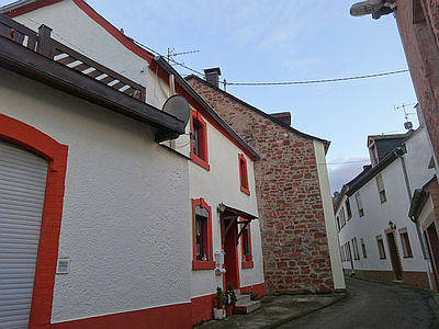 An die Außenmauer der ehemalige Burg gelehntes kleines Wohnhaus mit Krüppelwalmdach. [1]