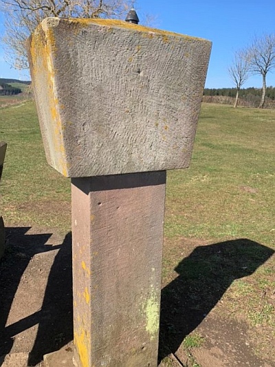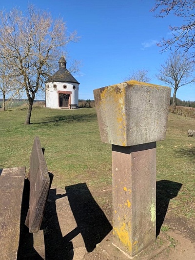 Auf einem dem Friedhof gegenüberliegendem Tufffelsen steht ein 1,63 m hohes Nischenkreuz aus vulkanischem Tuff (17. Jahrhundert), das den Anfang der früheren Kreuzwegstationen darstellen soll.