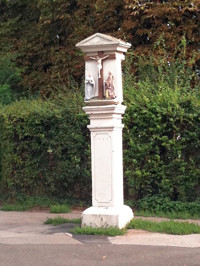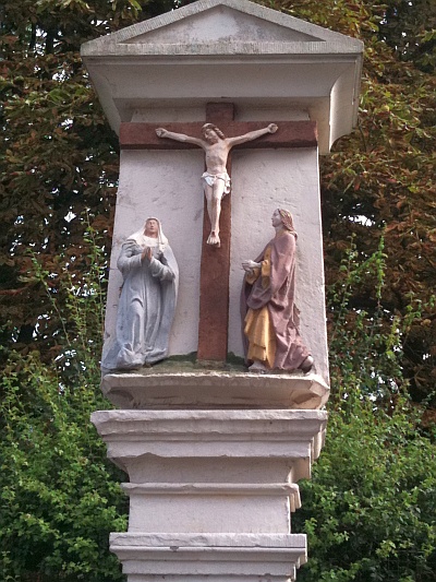 Vor erneuerter Rückwand Kreuzigung mit Maria und Johannes in antikisierenden Gewändern, beide schreiten mit vor der Brust gefalteten Händen, Maria in frontaler Stellung, Johannes zum Kreuz gewandt. Die Assistenzfiguren aus der Entstehungszeit, der Korpus jünger, der abschließende Dreiecksgiebel erneuert.