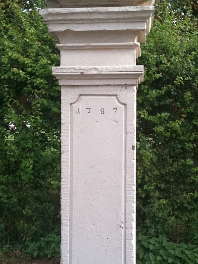 Bildstock aus rotem Sandstein auf niedrigem Sockel und hohem gerahmten Schaft, auf dem die Jahreszahl 1787 angegeben ist.