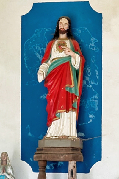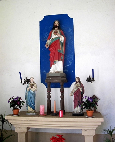 Das Innere mit dreiseitiger Lattendecke und schlichtem Stipesaltar, darauf heute Herz-Jesu-Figur aus Gips. [1]