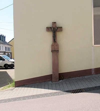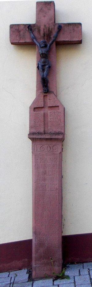 An die zur Zemmerer Straße gerichtete Giebelwand lehnt sich ein stark überarbeitetes Nischenkreuz von 1609; der an den Kanten schmal abgefaste Schaft ist wohl noch weitgehend original, die Nische wurde bis auf die Rückwand abgeschlagen, das ungewöhnlich große Abschlußkreuz ist mit metallenem Korpus. 1955 wurde das Kreuz von der Ecke Auwer/Zemmerer Straße hierher versetzt, wobei es den altarartig verbreiterten Unterbau einbüßte. Doch auch der frühere Standort war nicht mehr der ursprüngliche, wie die lange Inschrift mitteilt (im unteren Teil beschädigt): PRIMO ERECTA SUM 1609 FRANZ GRUMBACH ME FUNDI FECIT. HIC SUM POSITA EX MEDIA PLATEA SUB..., auf dem Sockel war noch das Datum 28. September 1833 zu lesen, das sich wohl auf die Versetzung und die Überarbeitung des Kreuzes bezog. [1]