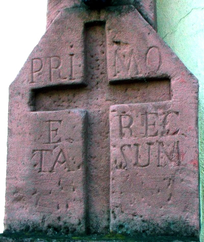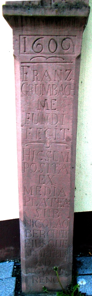 Zuerst wurde ich errichtet im Jahre 1609, Franz Grumbach hat mich gestiftet; hierhin wurde ich versetzt von der Mitte des Platzes unter Nikolaus Berscheid [1818-36 Pfarrer in Orenhofen] am 28. September 1833 [einem Samstag] und auf dessen Kosten renoviert [für 9 Thaler].