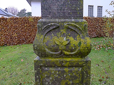 Das Abschlußkreuz mit Korpus und doppelt gespaltenen Balkenenden trägt an der Rückseite die Inschrift: