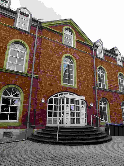 Ehemaliges Häutemagazin des Handelshauses Rautenstrauch & Co.; Fassade des spätklassizistischen Sandsteinquaderbaus mit Walmdach, bald nach 1861 erbaut. [1]