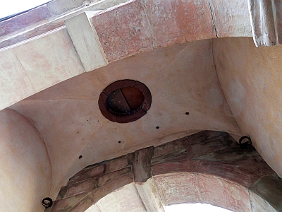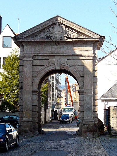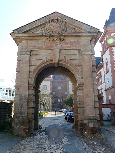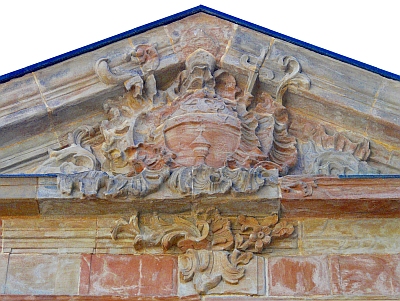 Barocker Portalbau, übergiebeltes Sandsteinquadertor mit zwei Abtswappen. [1]