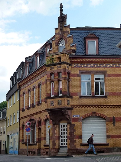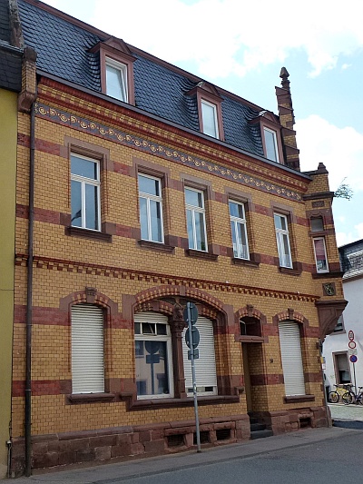 Stattlicher Backsteinbau mit mehrfarbiger Klinkerfassade und hochgezogenem Schieferdach, 1904. [1]