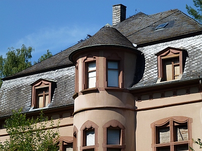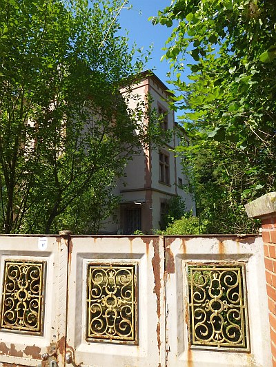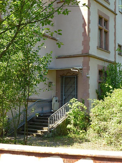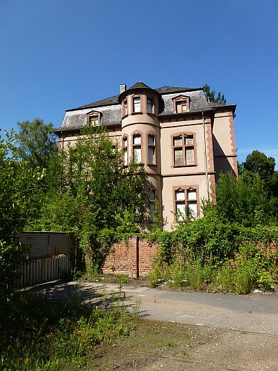 Großbürgerliche Villa; hoch aufragender sandsteingegliederter Putzbau mit Walmdach, Treppenturm und Erkerturm, neugotische Motive, um 1900. [1]