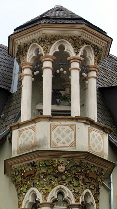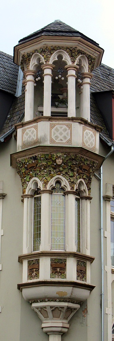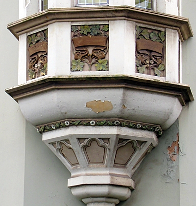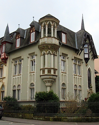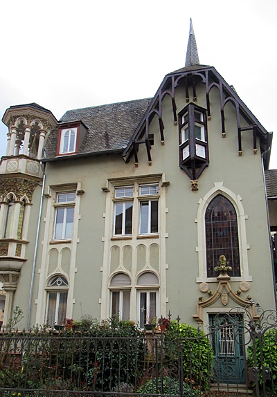 Halbvilla mit hohem Walmdach und reich dekoriertem Eckerker, neugotische Motive. [1]