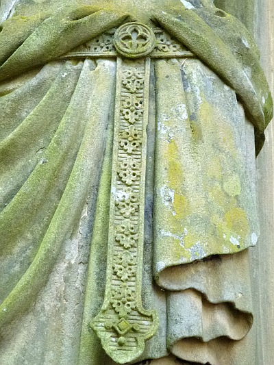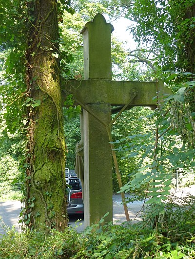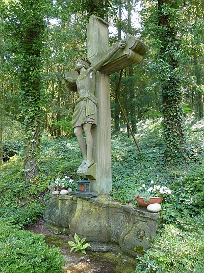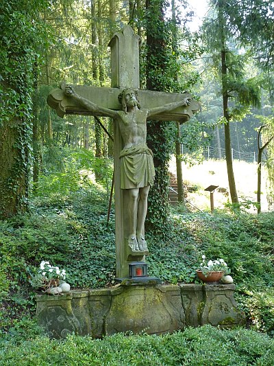 Rotsandstein, nachbarockes Postament, bezeichnet 1829, Kreuz und Korpus wohl aus dem späten 19. Jahrhundert. [1]