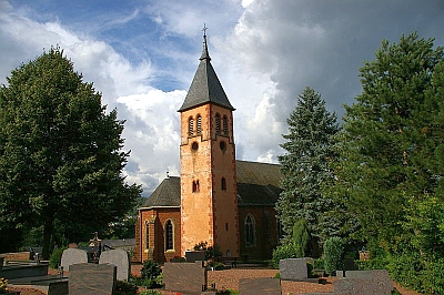 Die katholische Pfarrkirche wurde 1893 nach dem Abbruch der alten Kapelle errichtet. Vom Vorgängerbau wurde der verputzte, an den Ecken gequaderte dreigeschossige Turm in südlichen Winkel zwischen Chor und Langhaus übernommen. [1]