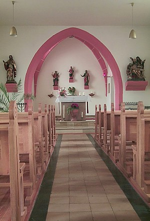 Gotischer Chor, 14. Jahrhundert, Saalbau mit Dachreiter, 1756, Erweiterung 1927. [1]