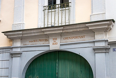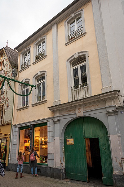 Das große zweiflügelige Tor mit Korbbogen und klassizistischer Lünetten- und Pilasterornamentik ist frankiert von zwei glatten Pilastern, die Kämpfersteine des Korbbogens sind in der Rücklage herausgearbeitet, die Kapitelle verkröpft, das Gebälk glatt, darüber eine auskragende gerade Verdachung; das Ganze trägt einen ebenfalls achsbreiten Balkon. Er hat ein sehr schönes schmiedeeisernes Geländer mit vier lorbeerumkränzten Medaillons mit Cäsarenhäuptern!
