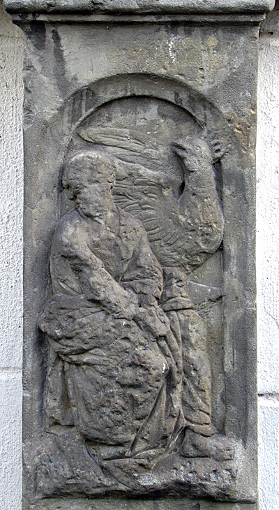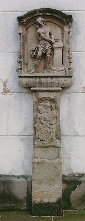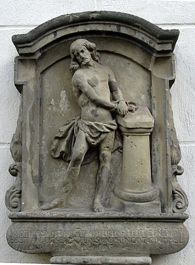 An der Pfarrkirche, datiert 1693 mit Darstellung von Petrus mit Schwert und Hahn (unten) und der Geißelung (oben). Teil eines ehemaligen Stationenweges der Sieben Fußfälle. [1]