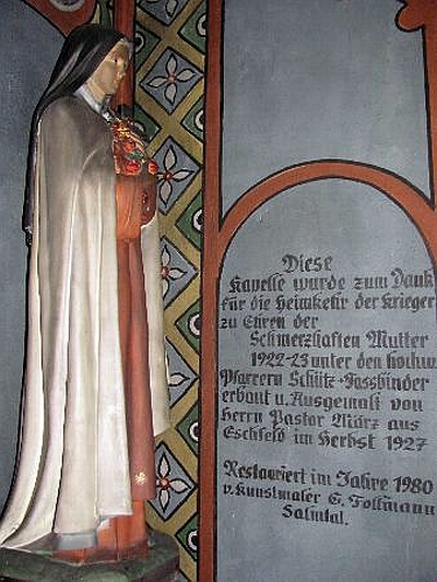"Diese Kapelle wurde zum Dank für die Heimkehr der Krieger des 1. Weltkrieges zu Ehren der Schmerzhaften Mutter 1922 / 23 unter den Hochw. Pfarrern Schütz und Fassbinder erbaut und ausgemalt von Herrn Pastor März aus Eschfeld im Herbst 1927. Restauriert im Jahre 1980 v. Kunstmaler S. Follmann, Salmtal".