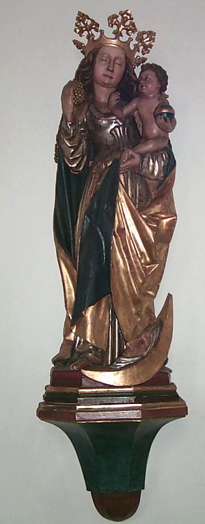 Die Statue stellt Maria, die Mutter Gottes dar, dass Kind auf dem Arm haltend und mit der anderen Hand eine Weintraube dem Betrachter darreichend; den Mond zu ihren Füssen. Die Weltkugel - Zeichen der göttlichen Macht, - wird in der einen Hand des Kindes gehalten. Der Mantel der Madonna, wie die Kleidung überhaupt, ist in ihren Linien stark betont.; - in der Gotik tritt der Körper stark hinter der Kleidung zurück. Eine fein gearbeitete Krone bedeckt einen zierlichen Kopf, der weiche Züge aufweist und der Blick verliert sich in die Ferne.
