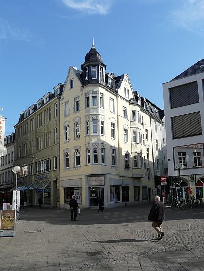 Viergeschossiges Eckwohn- und Geschäftshaus, abwechslungsreicher Fassadendekor. [1]