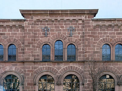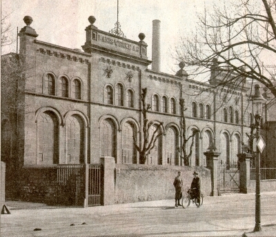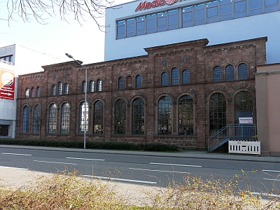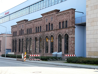 Eine der frühesten Trierer Industrieanlagen; 36-achsige Straßenfassade, Mittelteil eingeschossig und verputzt, eineinhalbgeschossige Seitenteile mit kleinen roten Sandsteinquadern verkleidet, neuromanische Motive. [1]