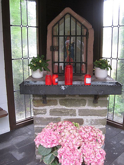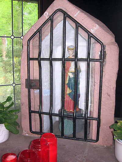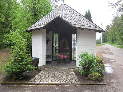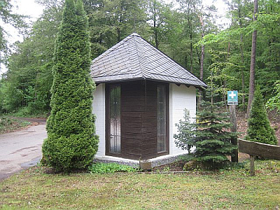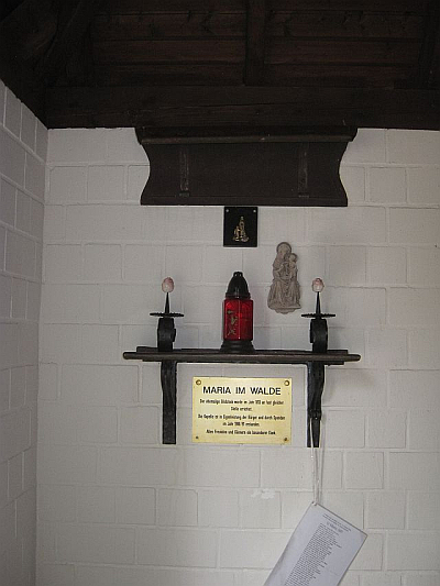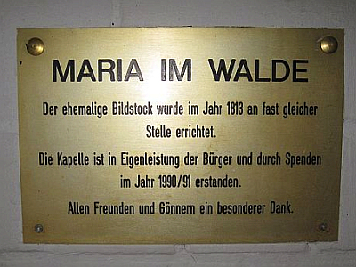 MARIA IM WALDE Der ehemalige Bildstock wurde im Jahre 1813 an fast gleicher Stelle errichtet. Die Kapelle ist in Eigenleistung der Bürger und durch Spenden im Jahr 1990/91 erstanden. Allen Freunden und Gönnern ein besonderer Dank. [1]